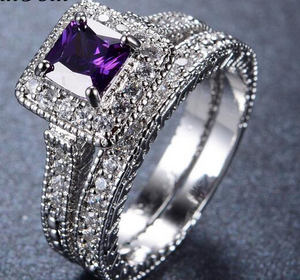3Ct Princess Cut Amethyst Bridal Set Halo Engagement Ring 18K White Gold Finish