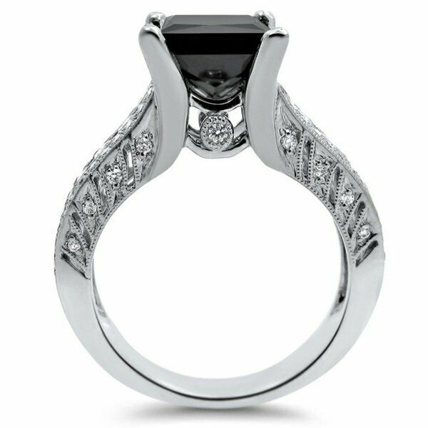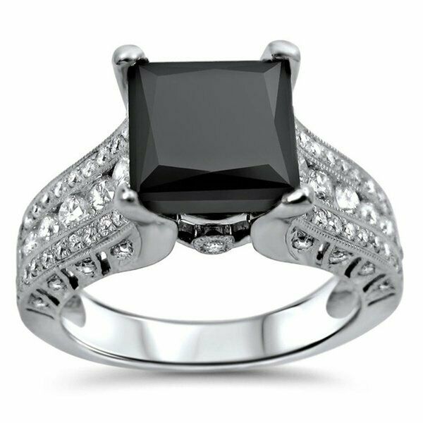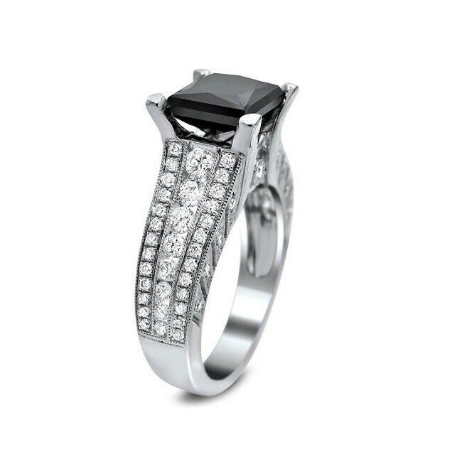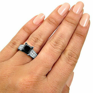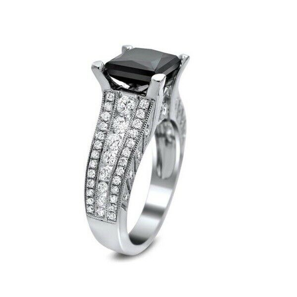 3Ct Princess Cut Black Diamond Engagement Ring 14K White Gold Over Round Accents