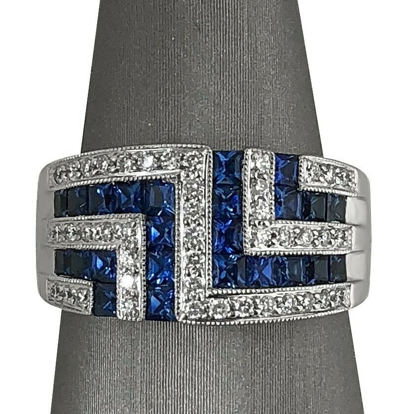 3Ct Princess Cut Blue Sapphire Diamond Art Deco Wide Ring 14K White Gold Finish
