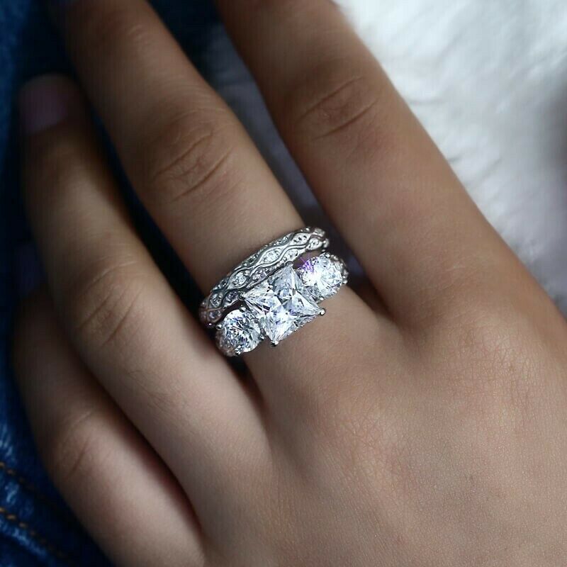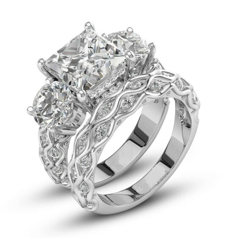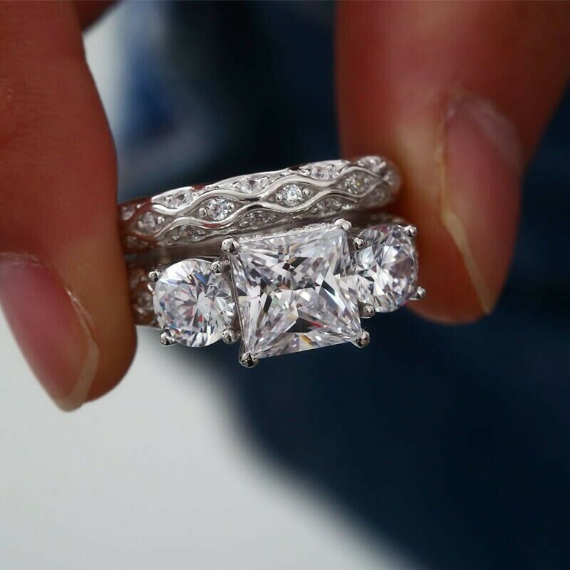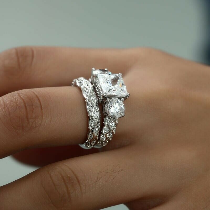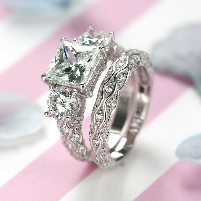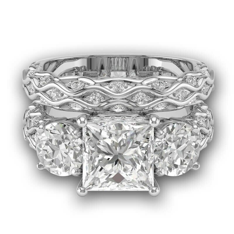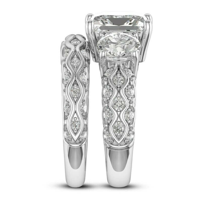 3Ct Princess Cut DVVS1 Diamond Bridal Set Engagement Ring 14K White Gold Finish