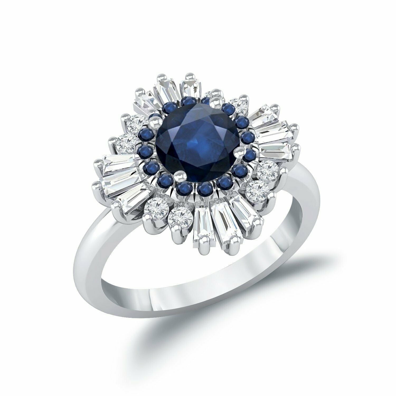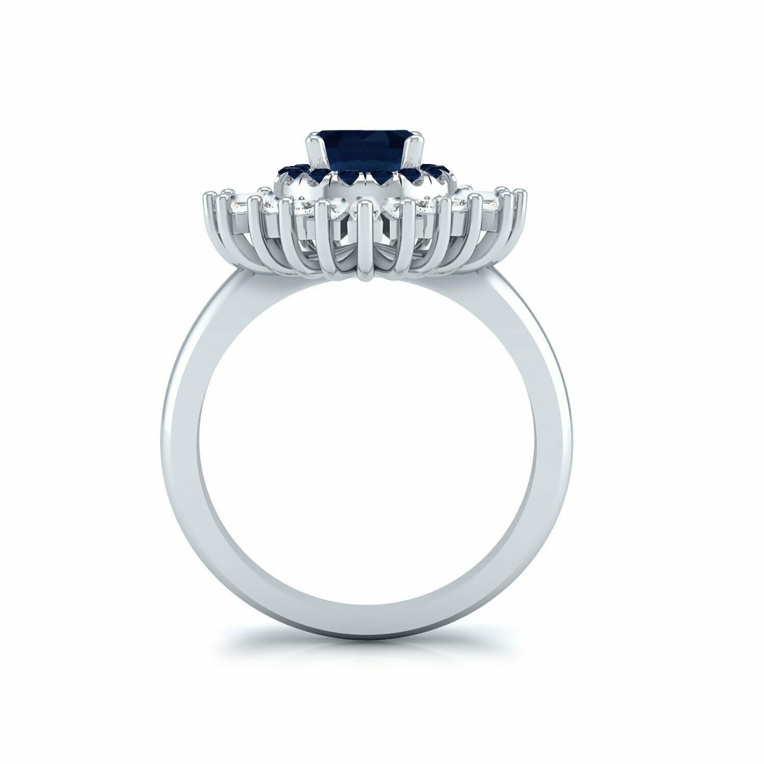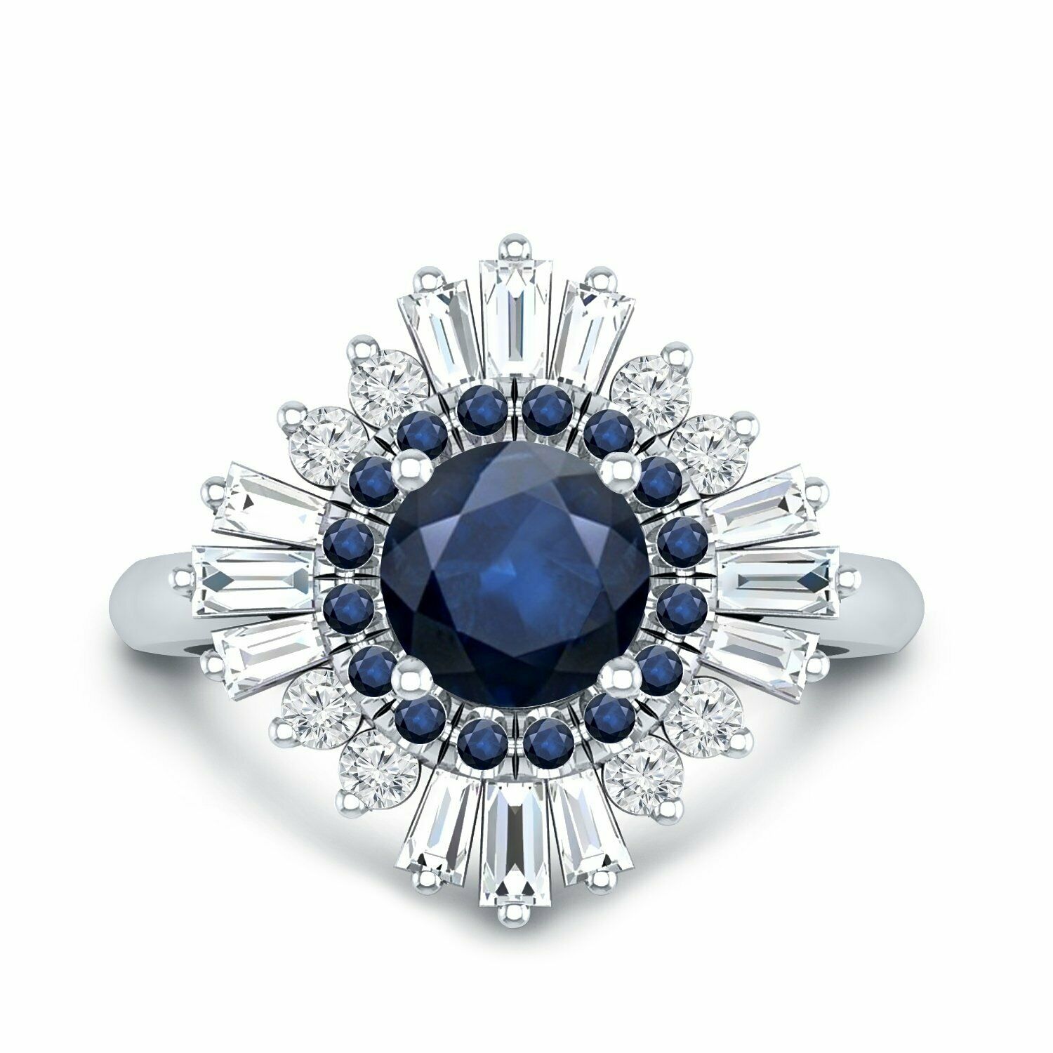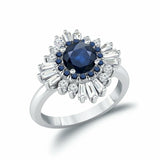 3Ct Round Cut Blue Sapphire Sunburst Diamond Engagement Ring 14K White Gold Over