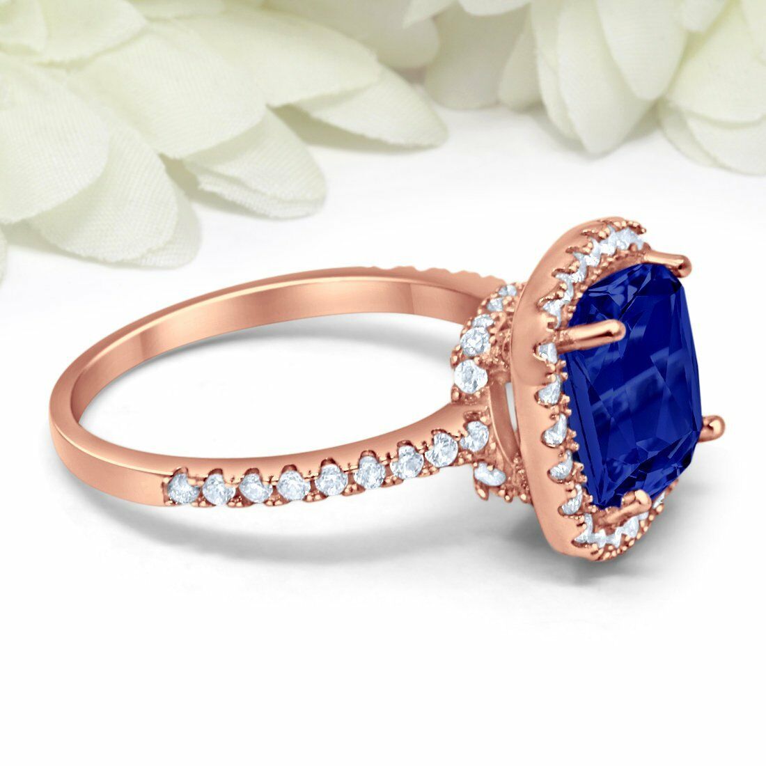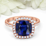 4.5Ct Cushion Cut Blue Sapphire Engagement Ring 14K Rose Gold Over Diamond Halo