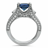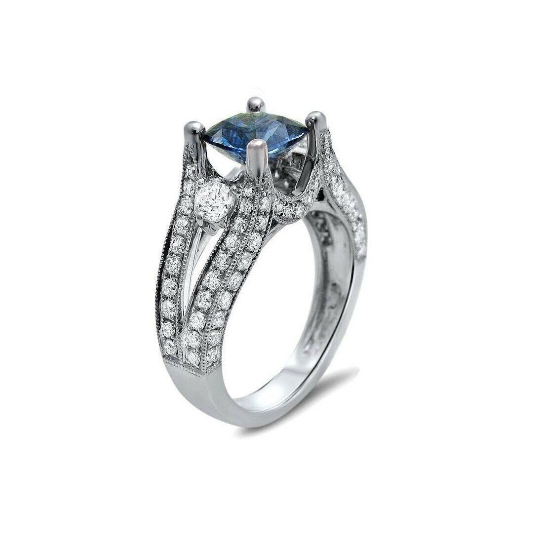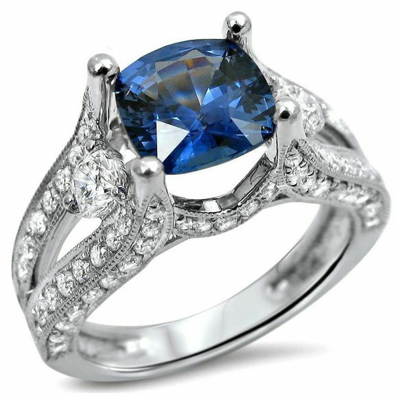 4Ct Cushion Blue Sapphire Split Band Vintage Engagement Ring 14K White Gold Over