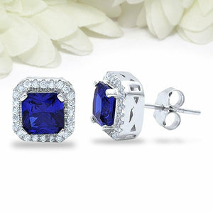 4Ct Cushion Cut Blue Sapphire Diamond Halo Stud Earrings 14K White Gold Finish