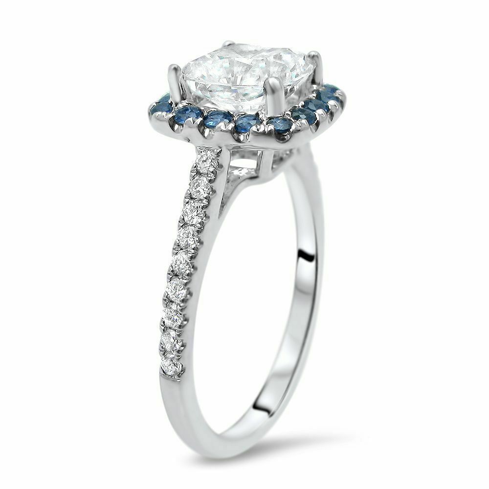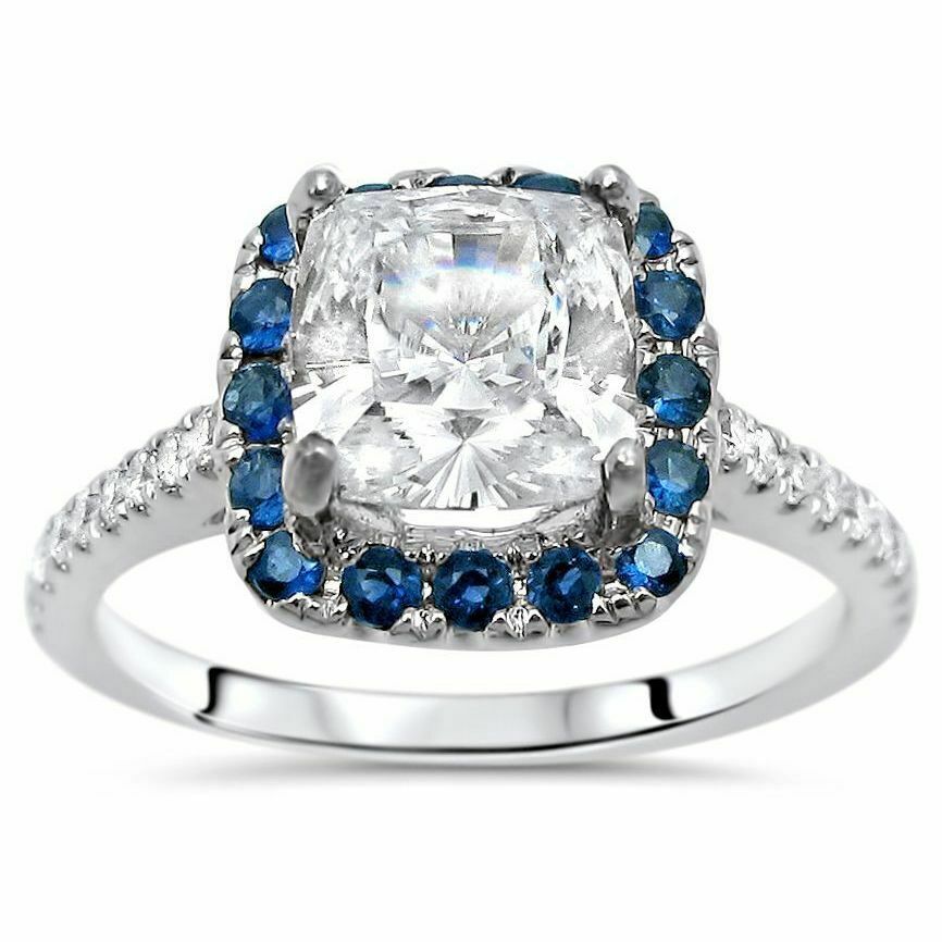 4Ct Cushion Cut Diamond Blue Sapphire Halo Engagement Ring 14K White Gold Finish