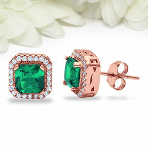 4Ct Cushion Cut Green Emerald Diamond Halo Stud Earrings 14K Rose Gold Finish