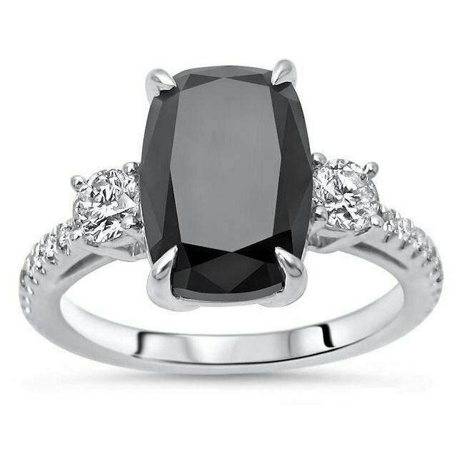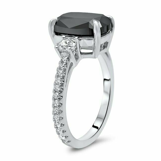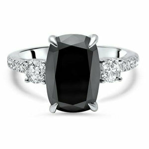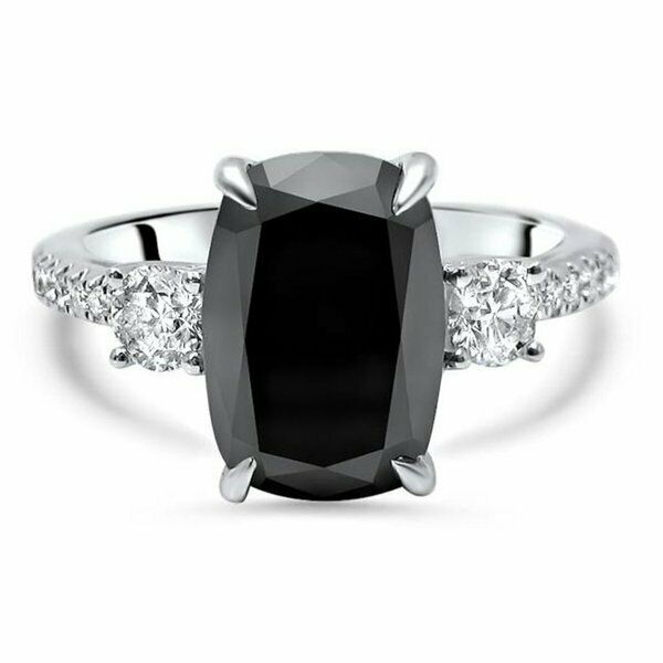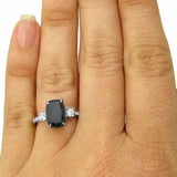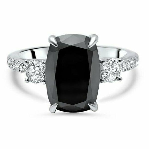 4Ct Elongated Cushion Black Diamond Accents Solitaire Ring 14K White Gold Finish