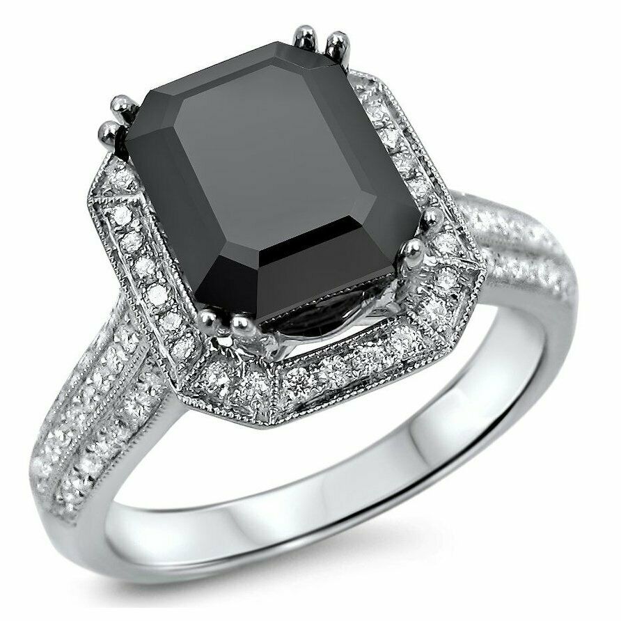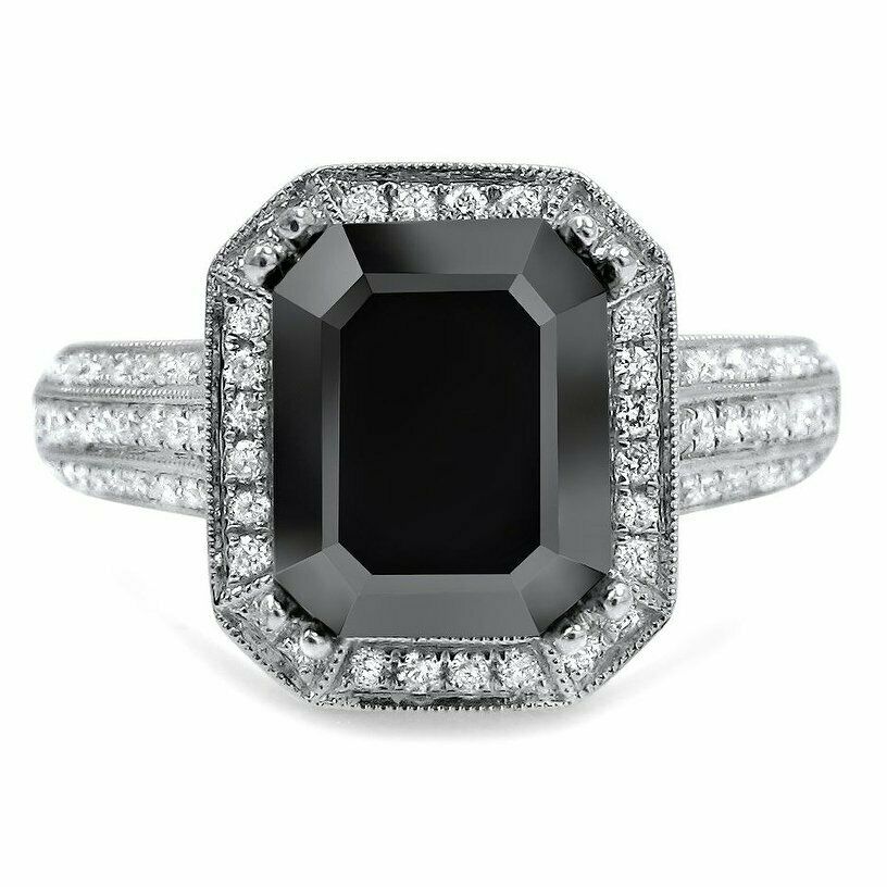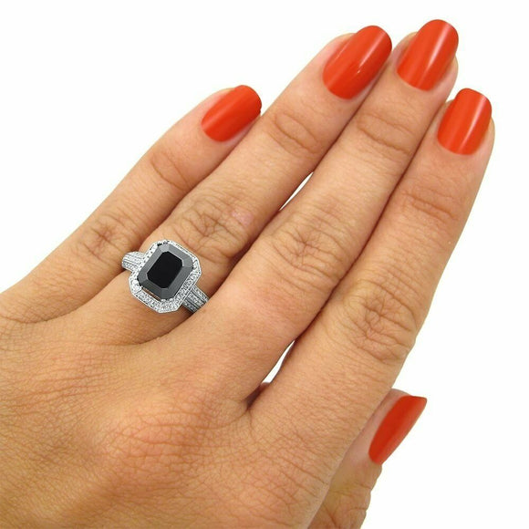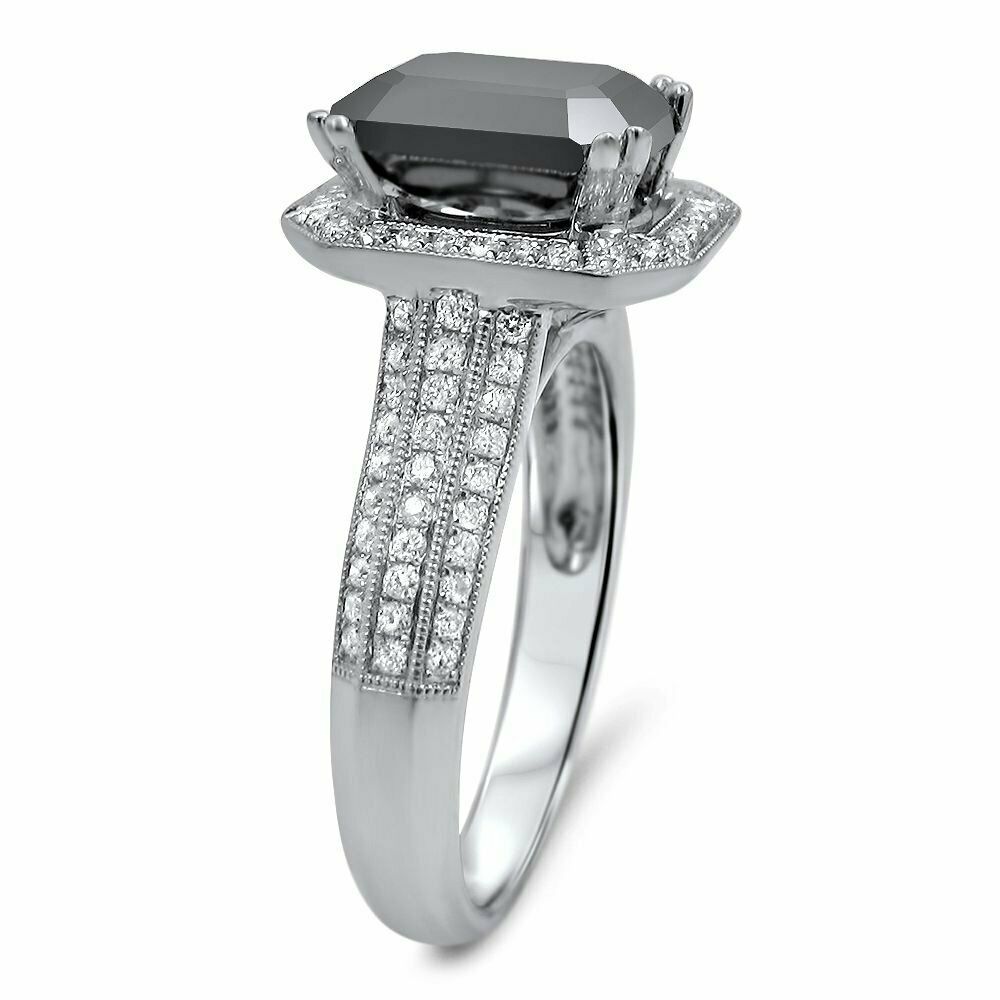 4Ct Emerald Cut Black Diamond Milgrain Halo Solitaire Ring 14K White Gold Finish
