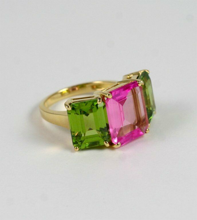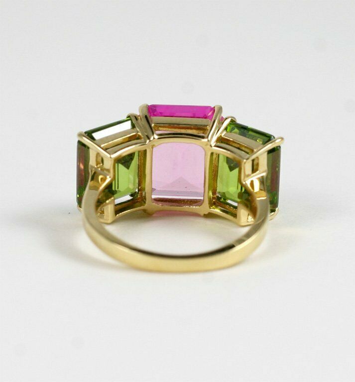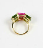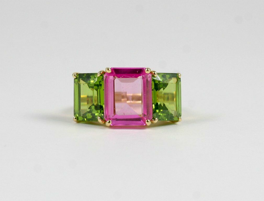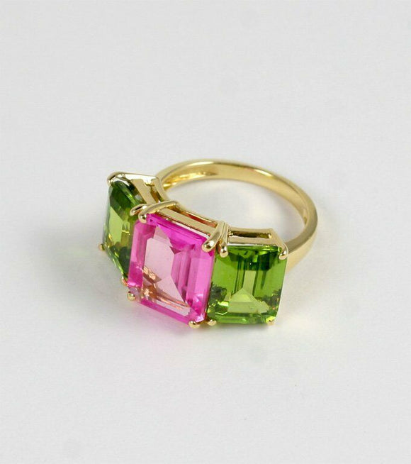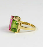 4Ct Emerald Cut Pink Sapphire Peridot Three Stone Ring 14K Yellow Gold Finish
