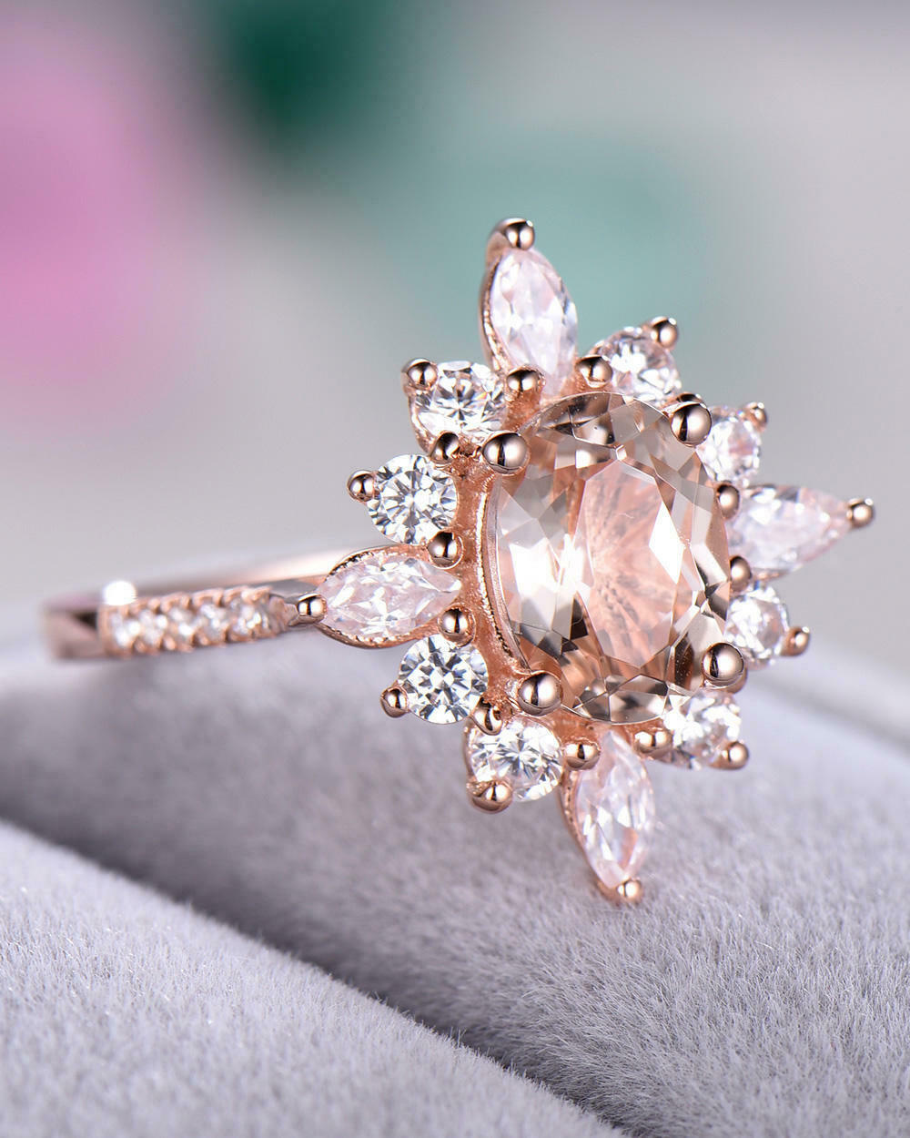 4Ct Oval Cut Peach Morganite Sunburst Halo Engagement Ring 14K Rose Gold Finish