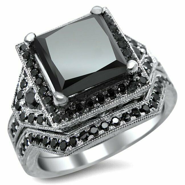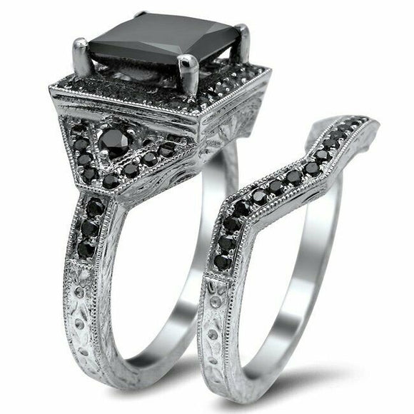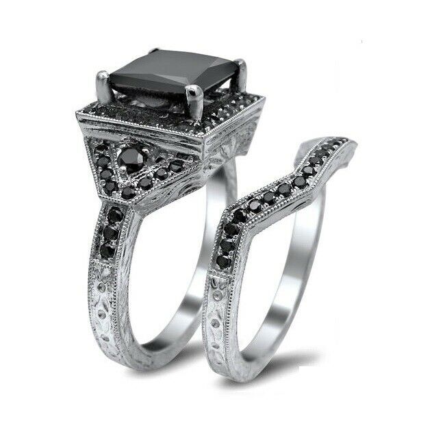 5Ct Princess Cut Black Diamond Vintage Bridal Set Ring Band 14K White Gold Over
