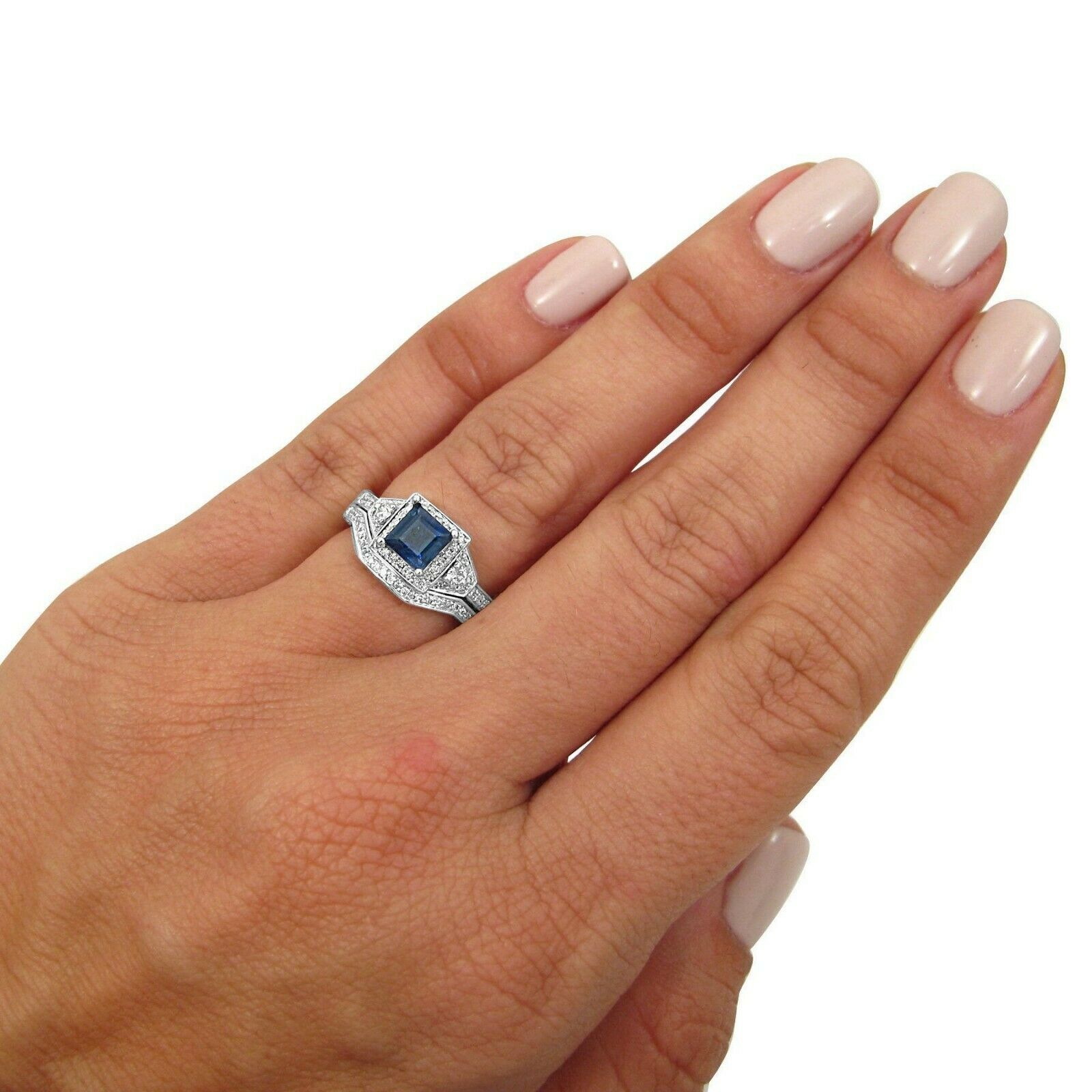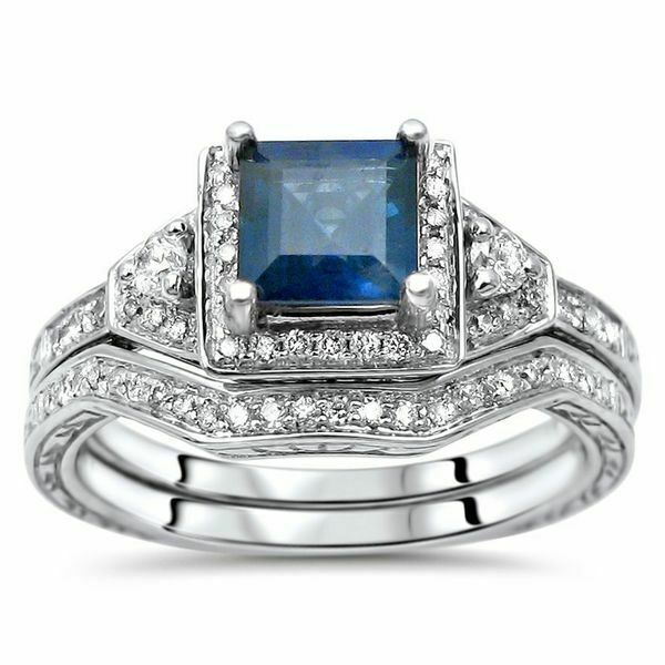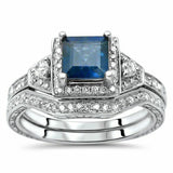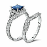 5Ct Princess Cut Blue Sapphire Diamond Vintage Bridal Set 14K White Gold Finish
