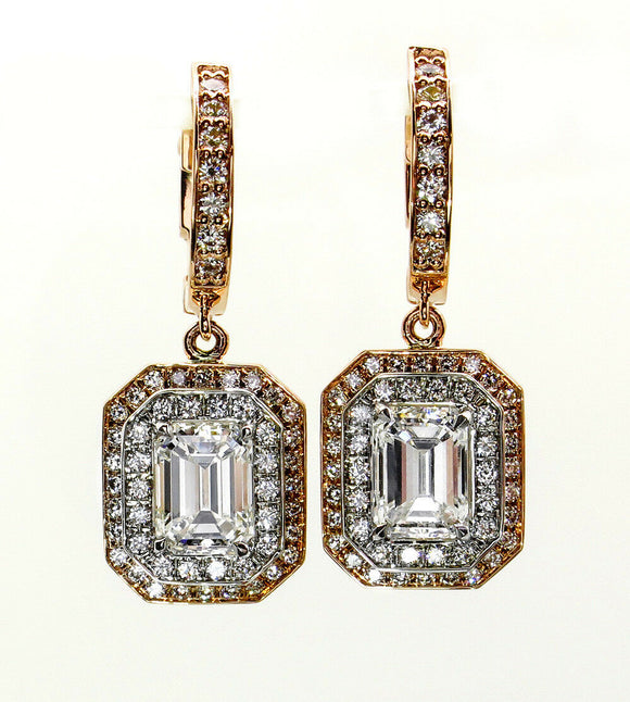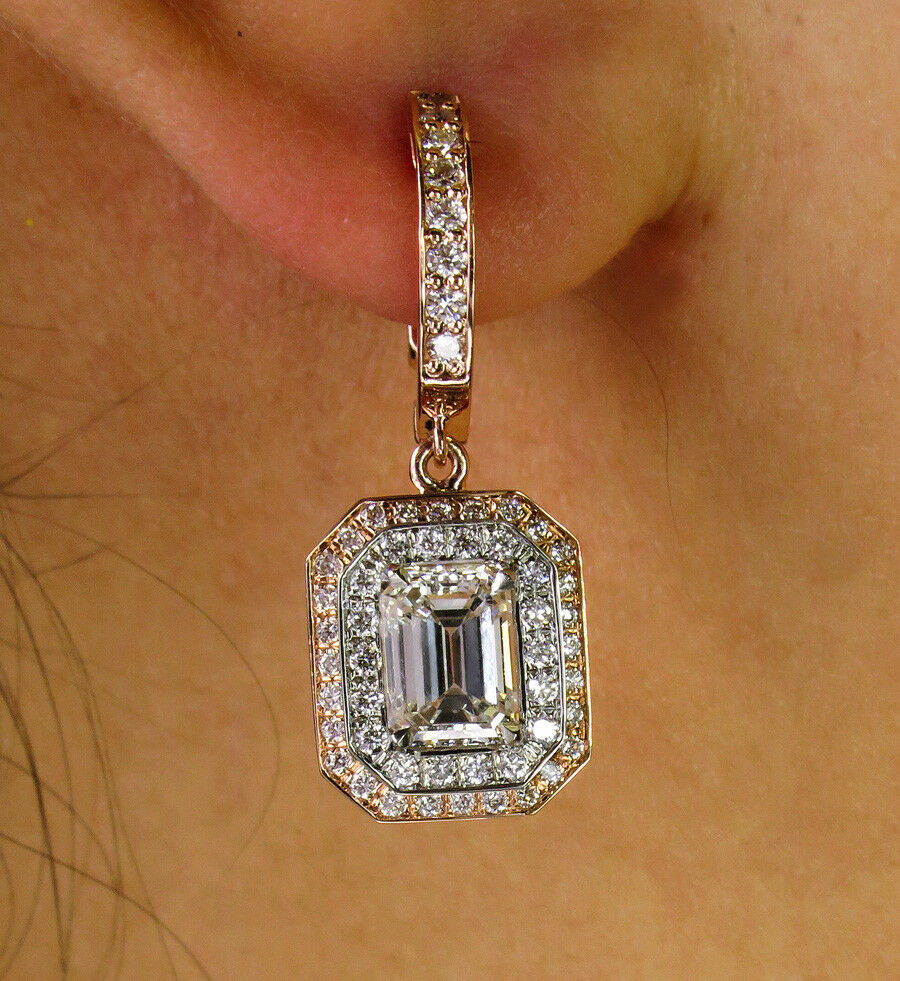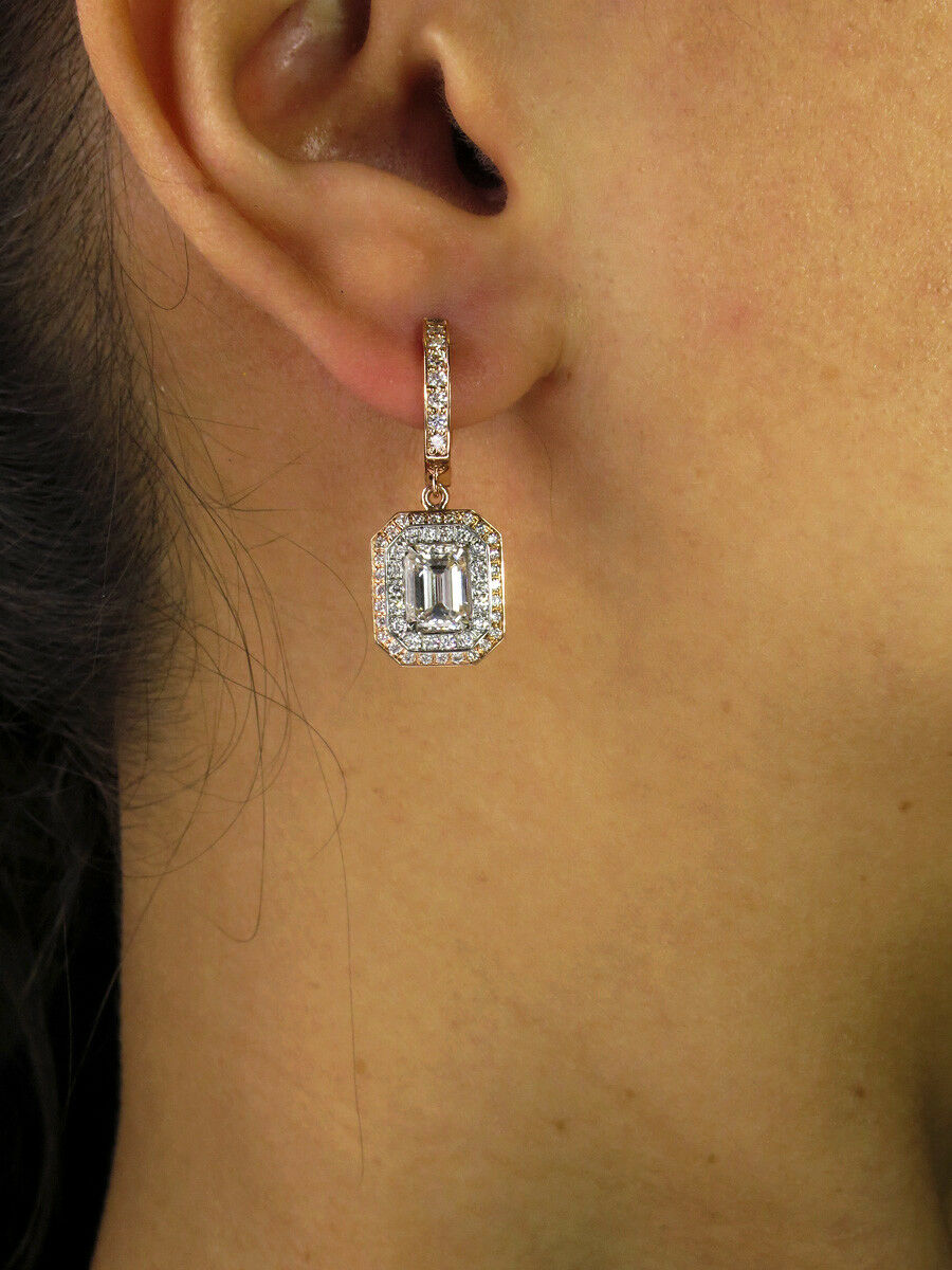 6Ct Emerald Cut Diamond Elegant Dual Halo Drop Earrings 14K Rose Gold Finish
