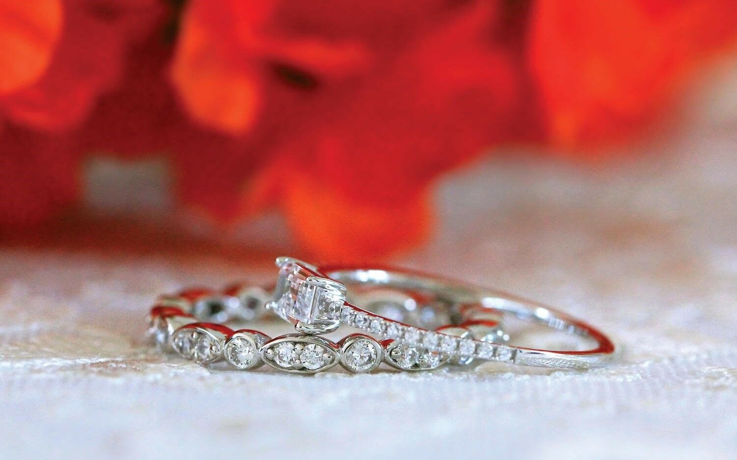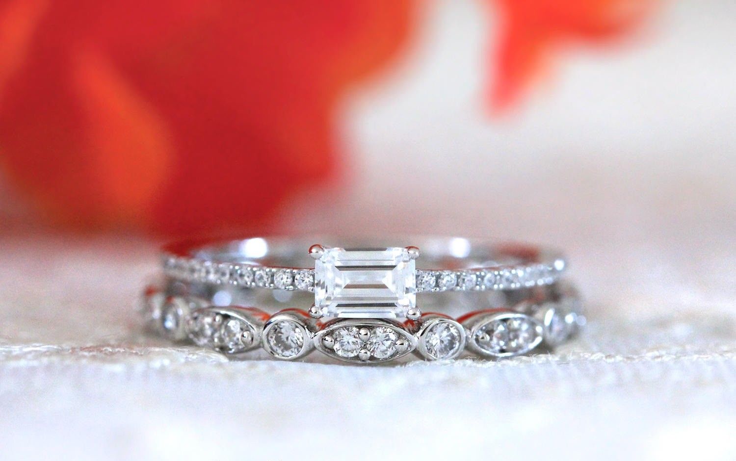 Art Deco Bridal Set Engagement Ring 1ct Emerald Cut Diamond 14k WhiteGold Finish