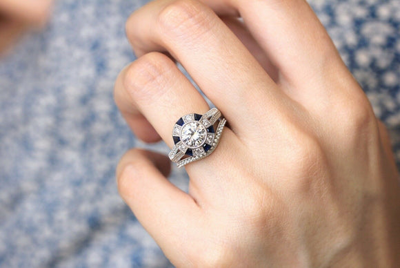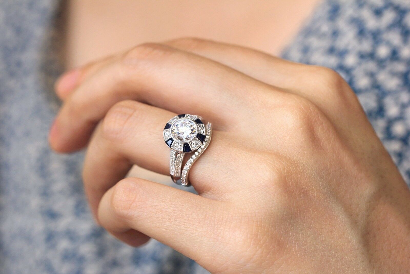 Art Deco Halo Bridal Set Curve Wedding Ring 2ct Round Diamond 14k WhiteGold Over