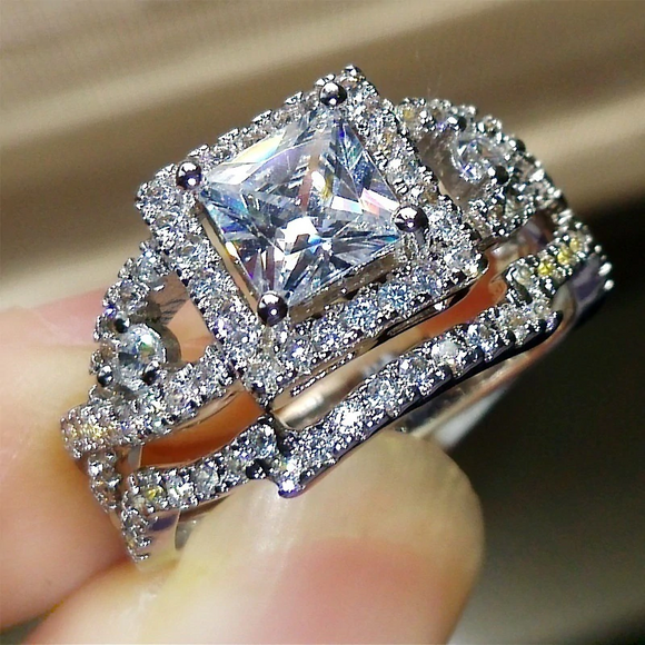 Halo Bridal Set Engagement Ring 2.5ct Princess Cut Diamond 14k White Gold Finish